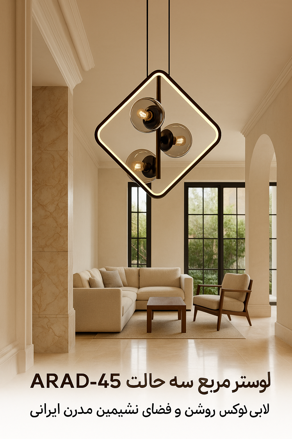 <meta name="description" content="لوستر مدرن ARAD-45 با قاب 45×45 سانتیمتر، سه حباب شیشهای دودی، بدنه مشکی، سه حالت نور (سفید/طبیعی/آفتابی)، سه سرپیچ معمولی E27، ارتفاع قابل تنظیم و توان 100 وات. مناسب نشیمن و فضاهای مدرن.">