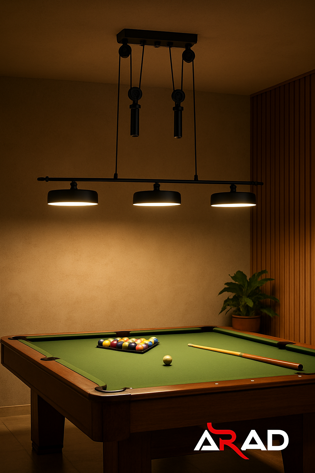 این مدل دارای سه منبع نوری ۲۴ وات است که مجموعاً روشنایی قدرتمند و یکنواختی را فراهم میکند. نور چراغ در سه حالت مختلف قابل تنظیم است تا بسته به نوع فضا—اعم از میز کانتر، بار یا میز بیلیارد—بتوانید بهترین حالت روشنایی را انتخاب کنید.
