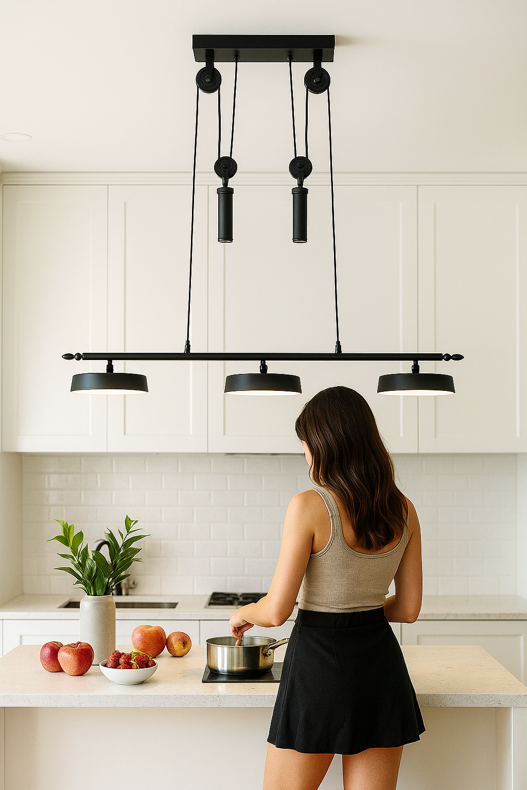 این آویز مدرن با طراحی مینیمال و بدنه مقاوم، گزینهای ایدهآل برای فضاهای حرفهای و خانگی است. ارتفاع چراغ بهصورت آسانسوری و کاملاً قابل تنظیم بوده و امکان هماهنگی دقیق با ارتفاع میز یا فضای نصب را فراهم میکند.